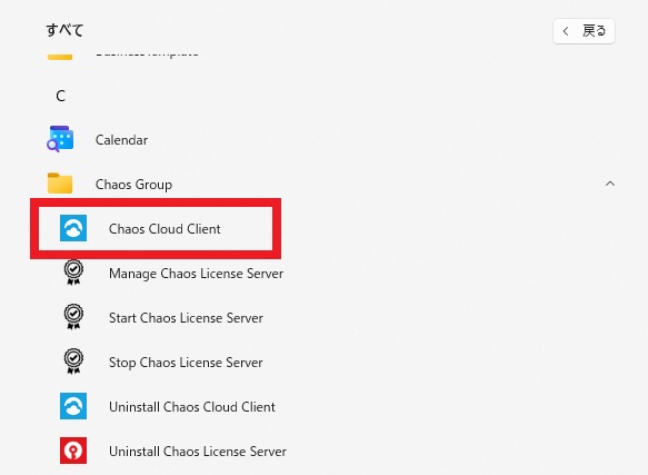 1.Windowsスタートメニューより「すべて」を選択し、「Chaos Group>Chaos Cloud Client」を実行してください。